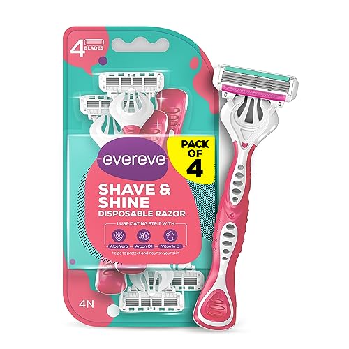 Evereve Shave & Shine 4 blade Disposable Razor for women, Pack of 4, Quick & Easy hair removal Aloe Vera, Argan Oil & Vitamin E, Pivoting head, Non-slip rubber handle,